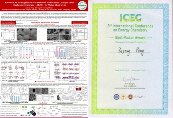 会议期间,研究生彭泽扬与国内外的同行积极互动,就研究进展进行深入探讨,特别是阴离子交换膜电解水制氢前沿技术和材料的研究方面。墙报展示环节,经国际会议评委会评定,彭泽扬展示的成果获得“Best Poster Award”奖项。