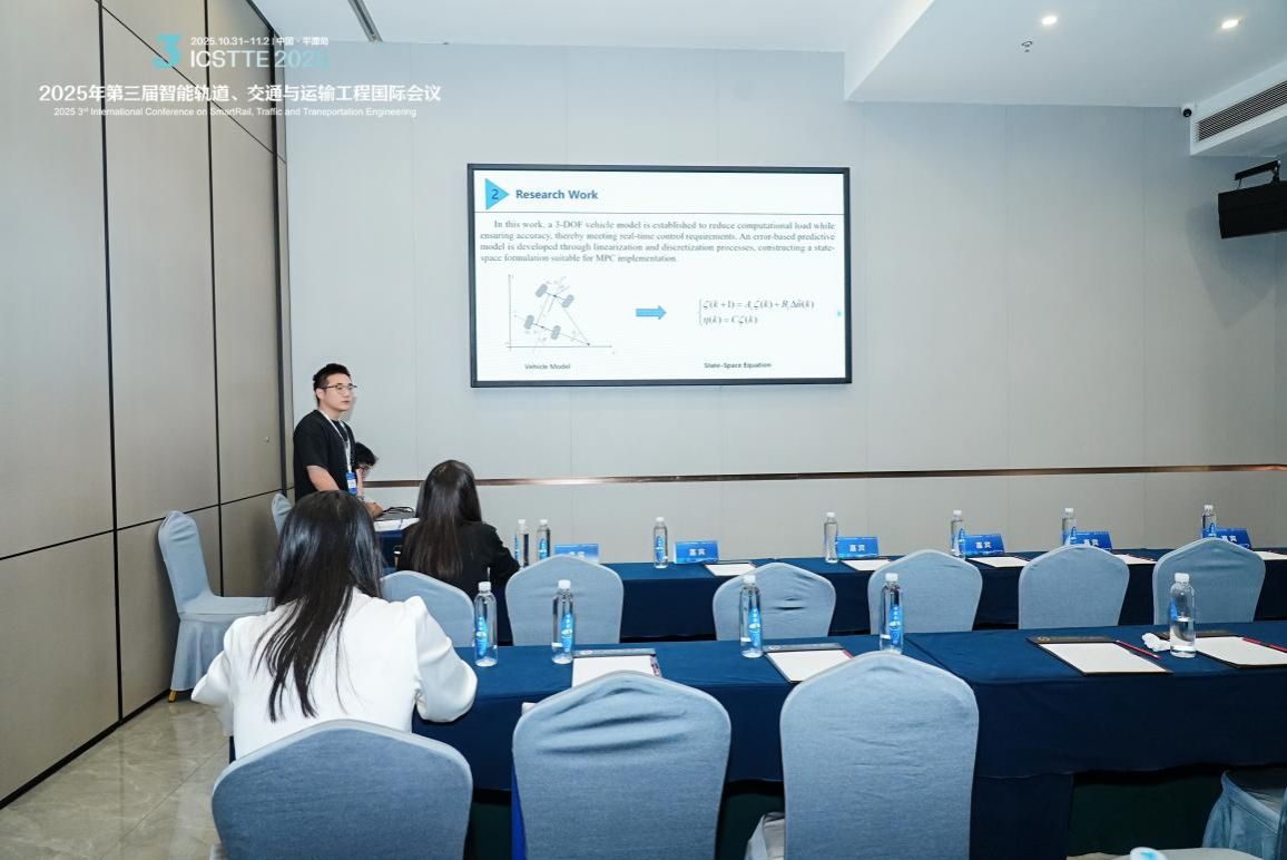 会议期间,公司研究生杜宇星在分会场作了题为“A Comparative Study of MPC Strategies for Distributed Drive Vehicle Trajectory Tracking”的报告,研究生韩亚恒在分会场作了题为“A Comparative Study of MPC Strategies for Distributed Drive Vehicle Trajectory Tracking”的报告,展示了公司在智能车辆控制与轨迹跟踪领域的研究成果。